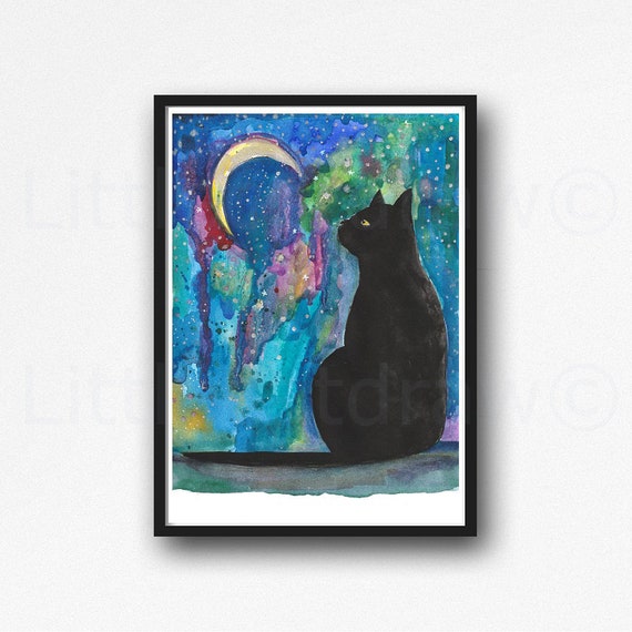 Moon Cat Print Black Cat Rainbow Galaxy Moon Watercolor Etsy