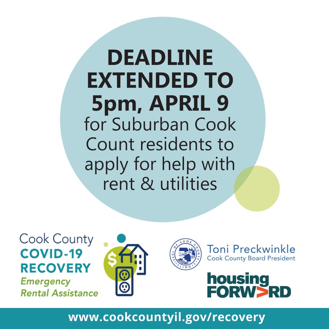 This is a crucial extension of our Emergency Rental. Tenants and landlords may apply at any time. Renters and landlords who cant pay rent and utility bills because of the pandemic can apply for up to 18 months of Cook County Emergency Rental Assistance by Oct.